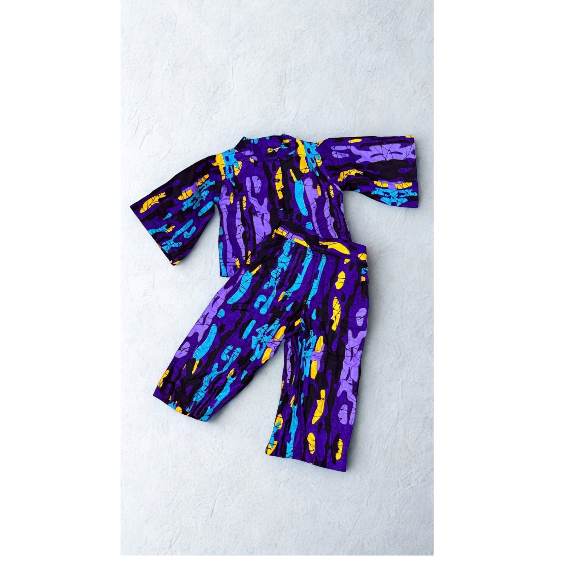 Vibrant Unisex African Print Two-Piece Set – Purple, Blue & Yellow Ankara OutfitBring colour, culture, and comfort together with this vibrant African Print Two-Piece Set.