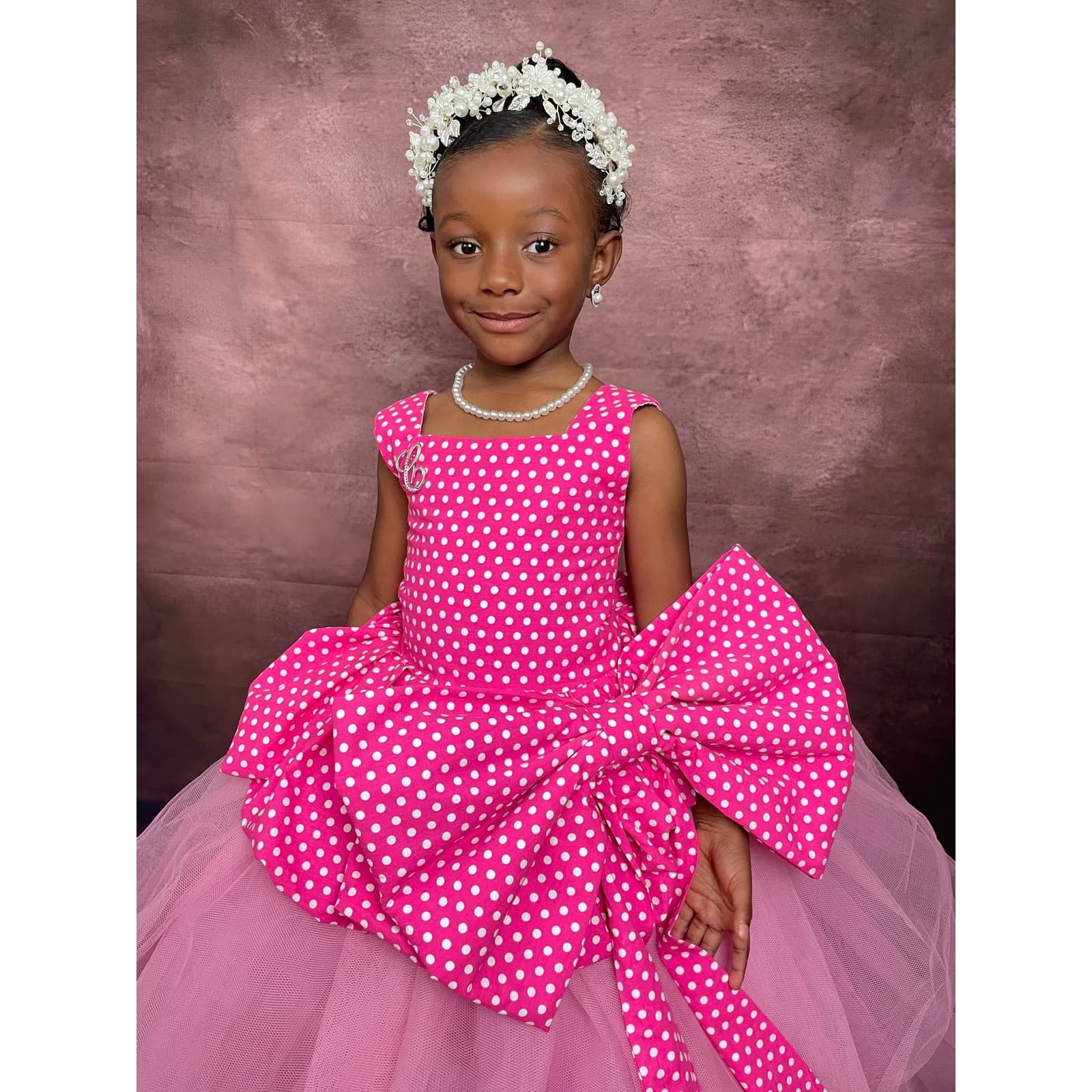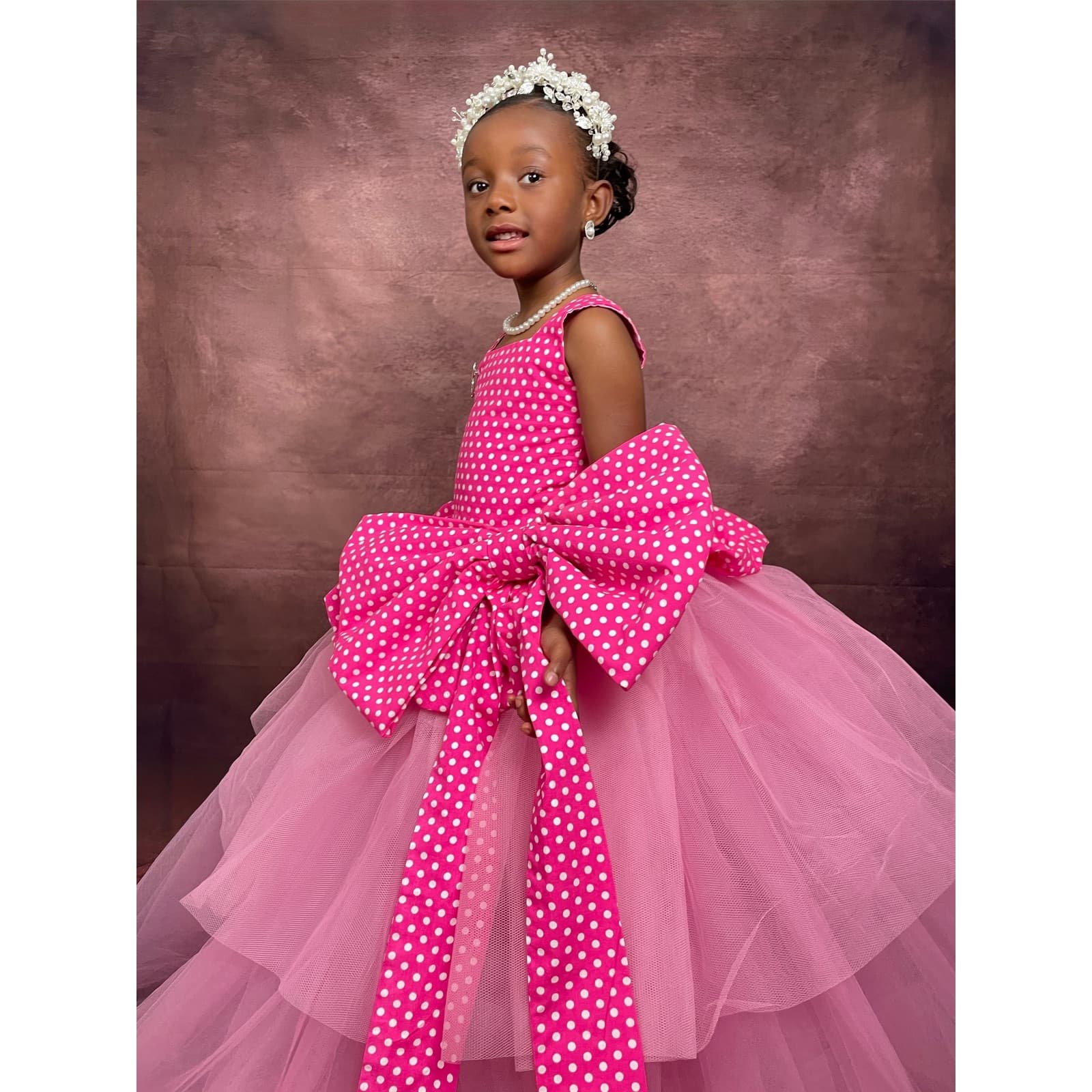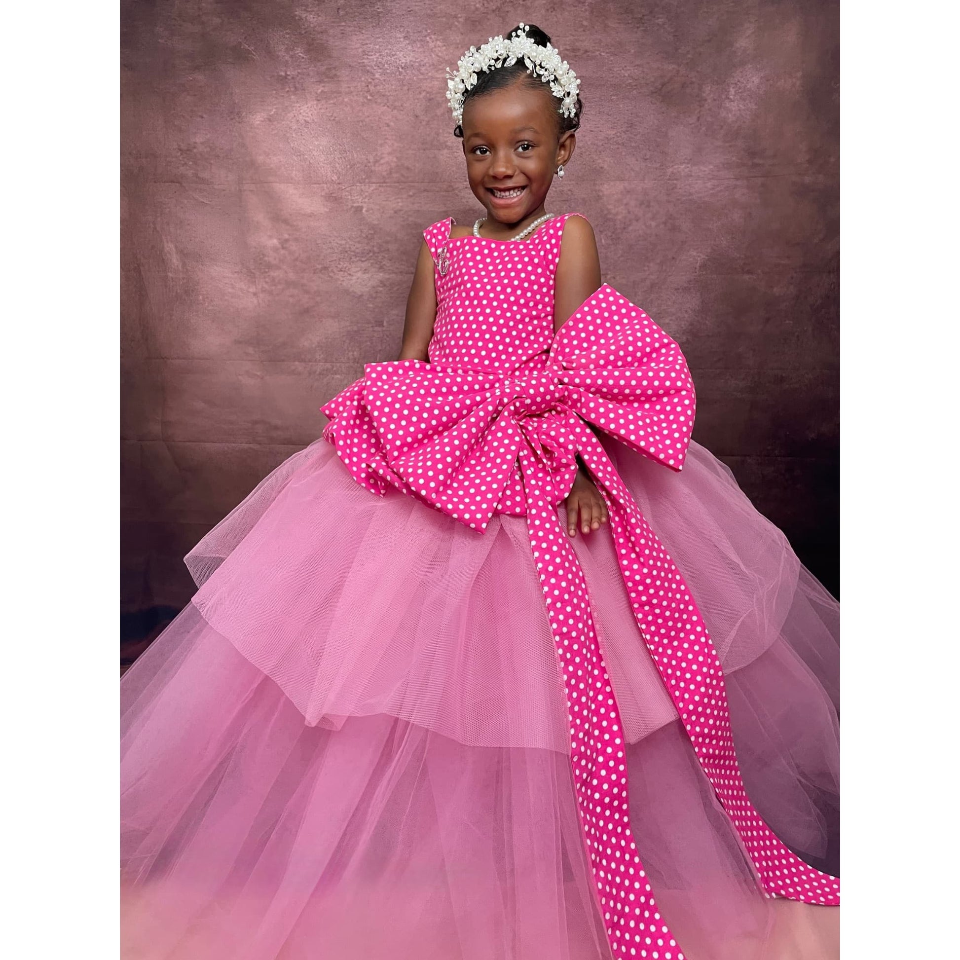The dress features a beautifully tailored bodice crafted from premium pink polka-dot fabric, finished with an oversized statement bow at the waist. A full, layered tulle skirt adds volume and drama, creating a timeless princess silhouette.