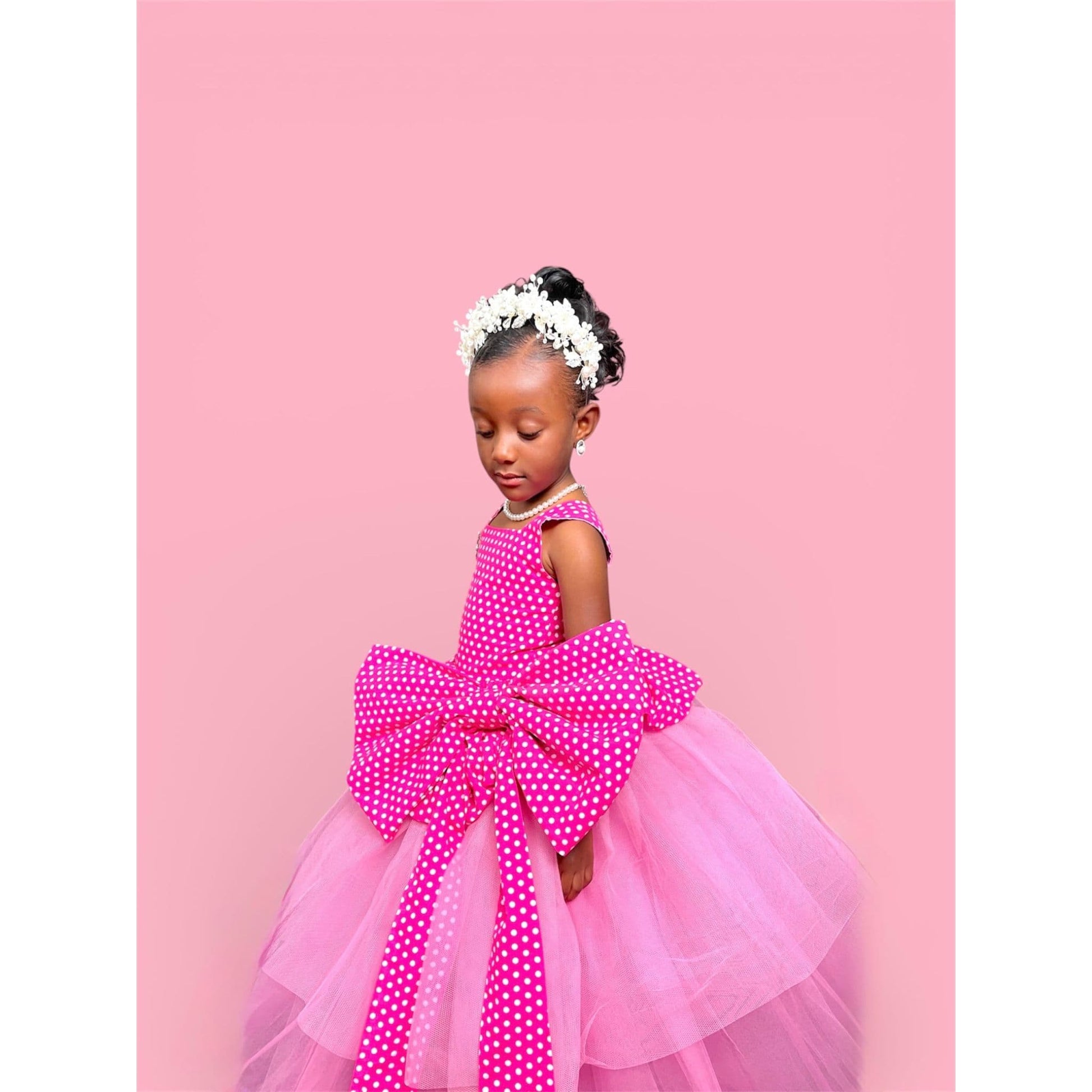 The Chloe Dress is a made-to-order luxury ball gown created for unforgettable childhood moments. Designed with elegance and joy in mind, this statement piece combines playful polka dots with couture-inspired structure.