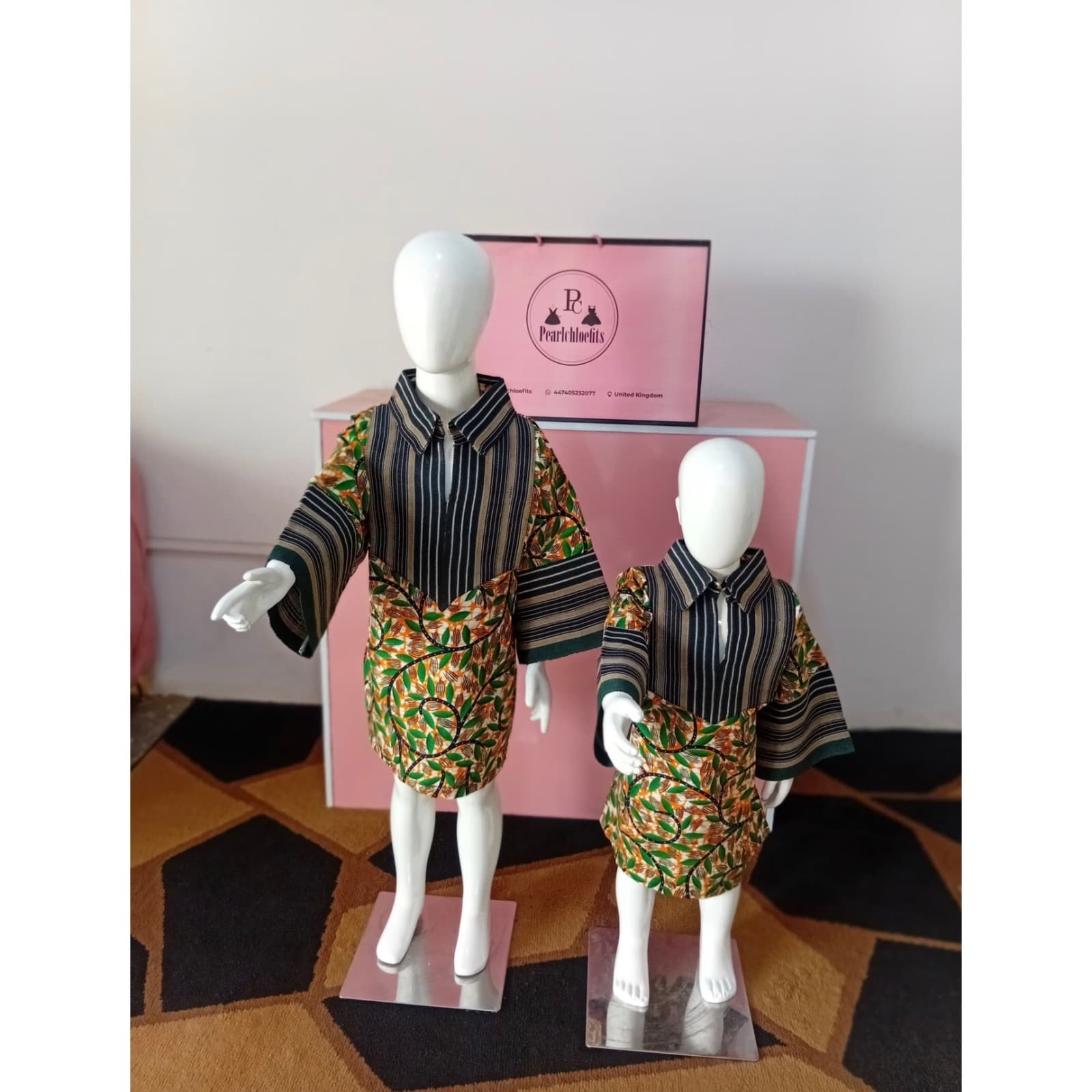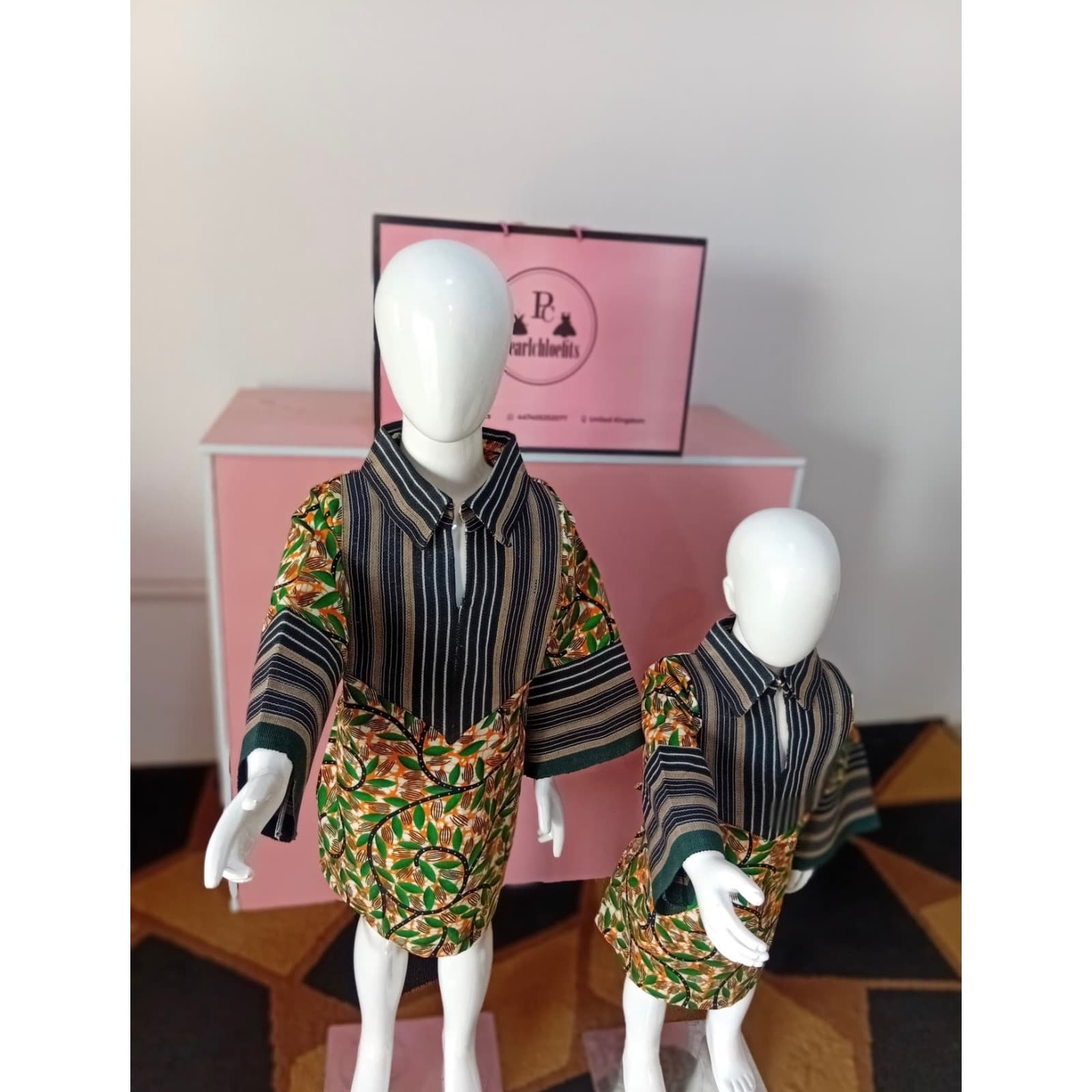 This dress features a classic shirt-style collar, enhanced with a distinctive Aso Oke front panel and matching Aso Oke sleeve detailing, creating a refined contrast against the vibrant African prints fabric used for the body of the dress. Thoughtfully designed for both style and practicality, it includes a side belt for adjustable fitting and a hidden inner side pocket, making it perfect for active yet stylish little girls.