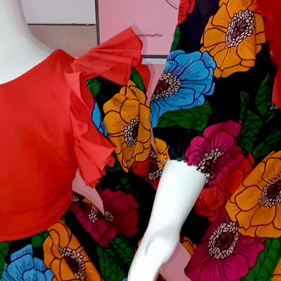 Our Mini Queens African Print Dress features a striking orange bodice paired with a multicoloured floral Ankara skirt, creating a perfect blend of culture and elegance.