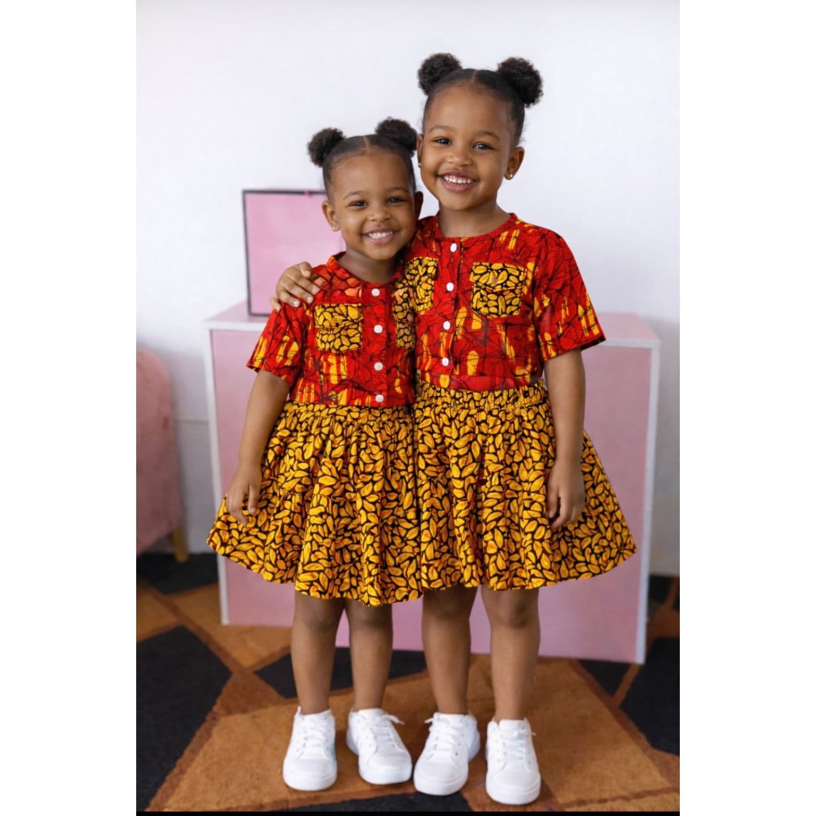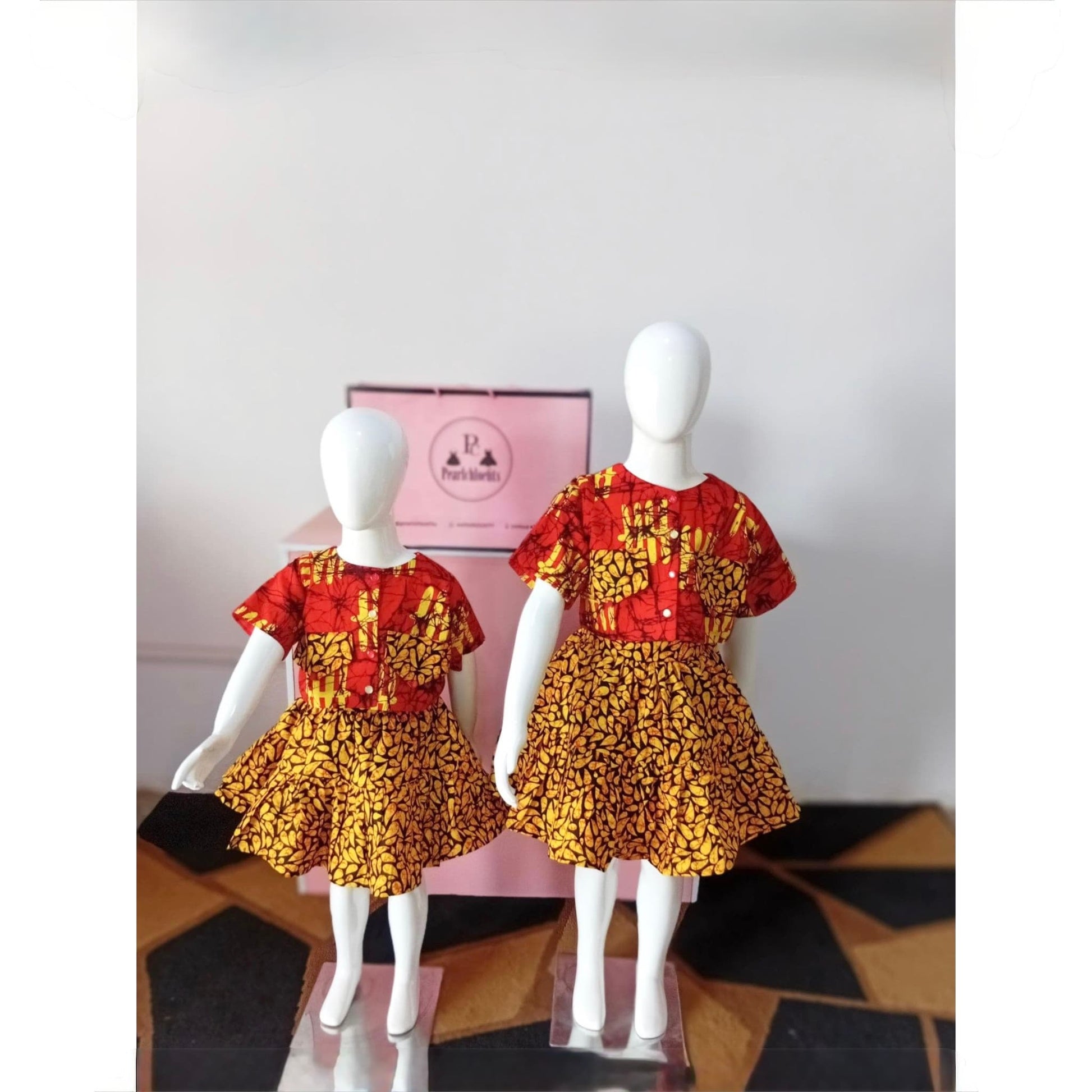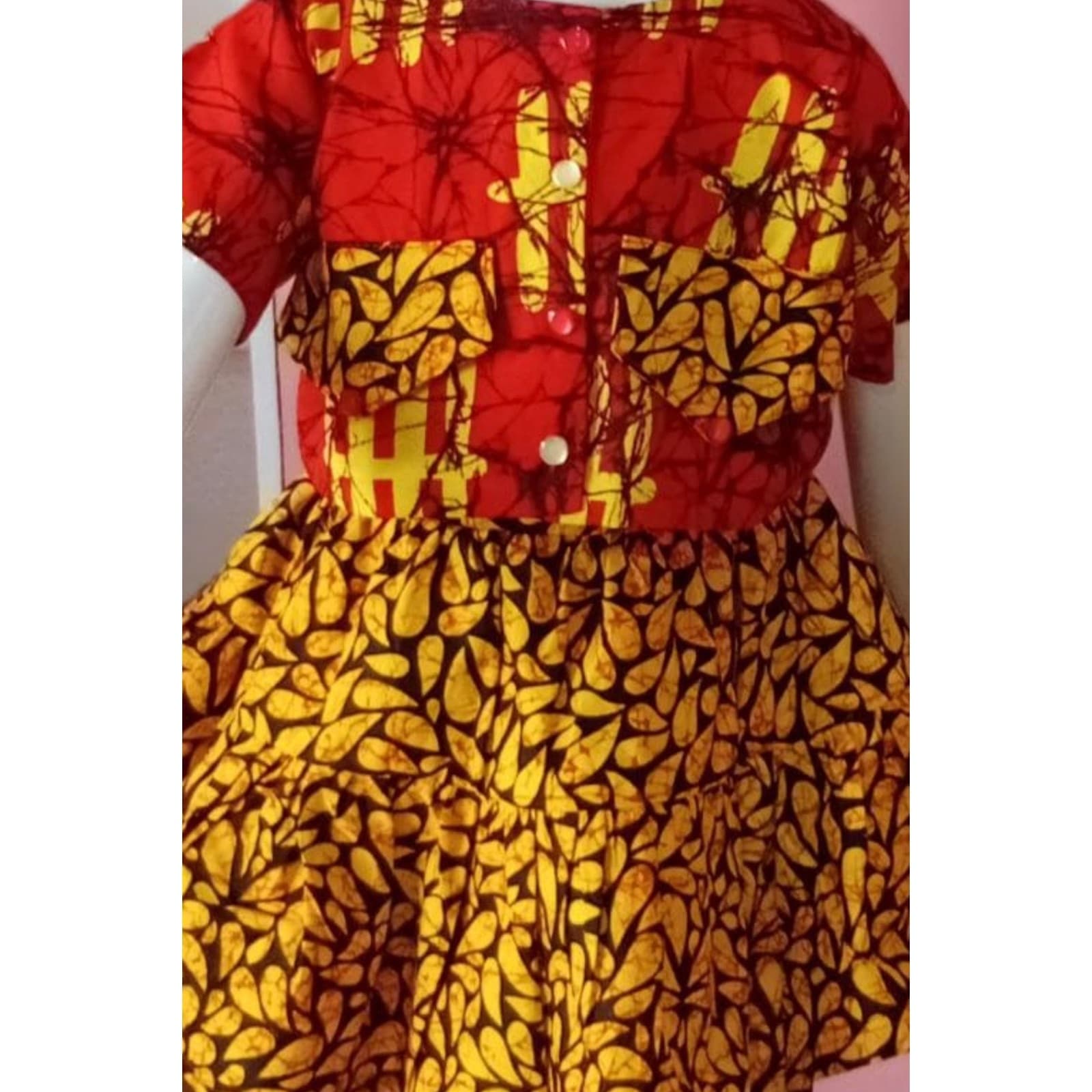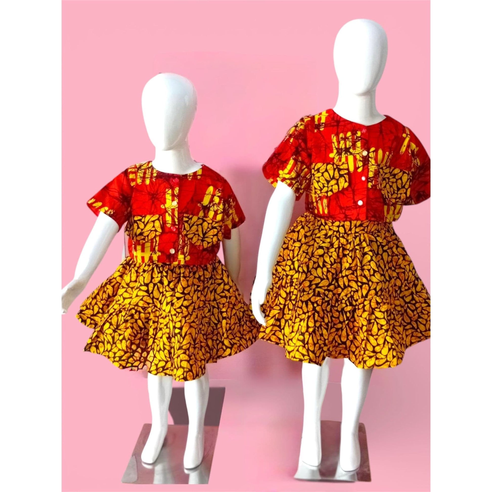 Designed for elegance, comfort, and playful charm, this African prints two-piece set is a beautiful expression of culture made for little girls. The set features a short-sleeve round-neck button top paired with a short gypsum skirt. A standout detail is the two decorative chest pockets, uniquely made from the same fabric used for the skirt, adding visual balance and thoughtful craftsmanship.